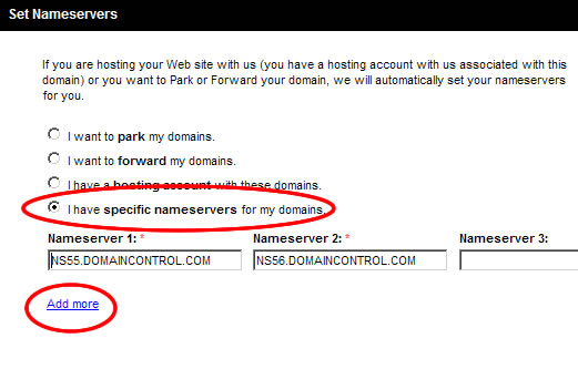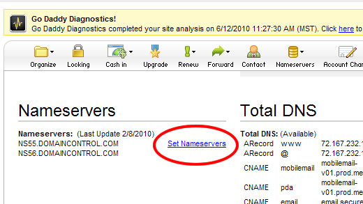 在域名管理面板中,點下拉框,在Nameservers管理項目下,點選Set Nameservers連接,進入DNS設置菜單