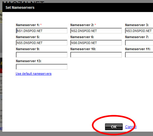 填寫dnspod給出的六組dns服務器地址后,點擊確定(ok)即可,在dodaddy的設置完畢,靜等生效。