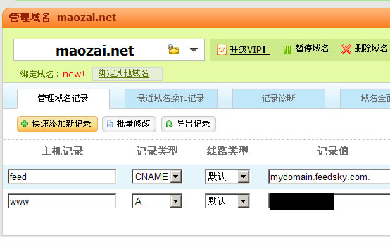 Dnspod的域名解析還是比較容易的,大家可以自己摸索著設置。至此,整個過程設置完畢,以后如果需要域名解析記錄,只需要登陸 dnspod.com修改即可,不在需要登陸godaddy.com,甚是快捷、方便吧!