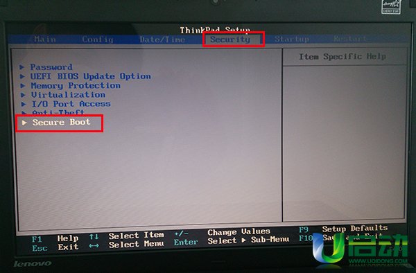 2、使用鍵盤上的左右方向鍵將光標(biāo)移至“security”欄目,再使用上下方向鍵將光標(biāo)移至“secure boot”選項(xiàng),按回車鍵執(zhí)行,如下圖所示: