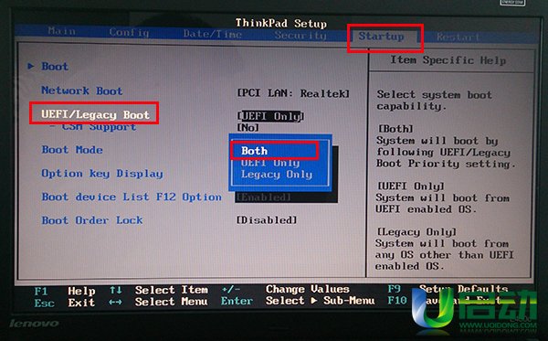 6、接著使用左右方向鍵將光標(biāo)移至“startup”欄目,再使用上下方向鍵將光標(biāo)移至“uefi/legacy boot”選項(xiàng),按回車鍵,在彈出的選擇窗口中,使用上下方向鍵將光標(biāo)移至“both”選項(xiàng),按回車鍵確認(rèn),如下圖所示: