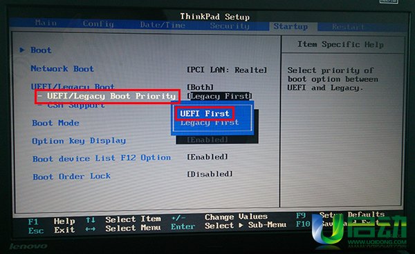 7、然后再使用上下方向鍵將光標(biāo)移至“uefi/legacy boot priority”選項(xiàng),按回車鍵確認(rèn),此時(shí)會(huì)彈出一個(gè)選擇窗口,將光標(biāo)移至“uefi first”選項(xiàng),按回車鍵確認(rèn),如下圖所示: