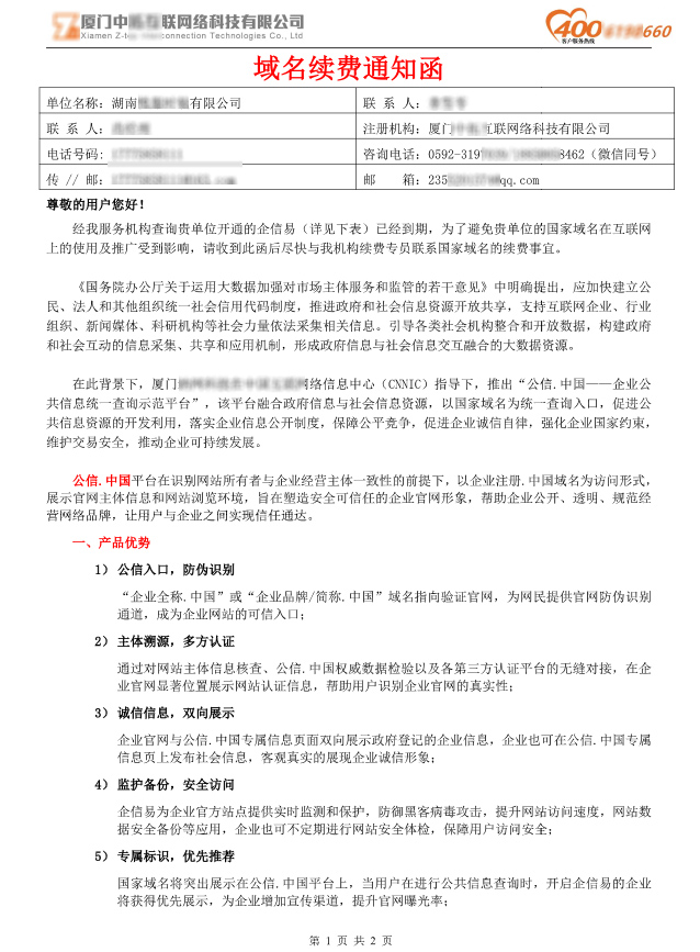 重要公告,謹(jǐn)防套路虛假續(xù)費(fèi)通知函或接到續(xù)費(fèi)電話的,講什么中文網(wǎng)址到期的客戶請(qǐng)謹(jǐn)防套路銷售與詐騙
